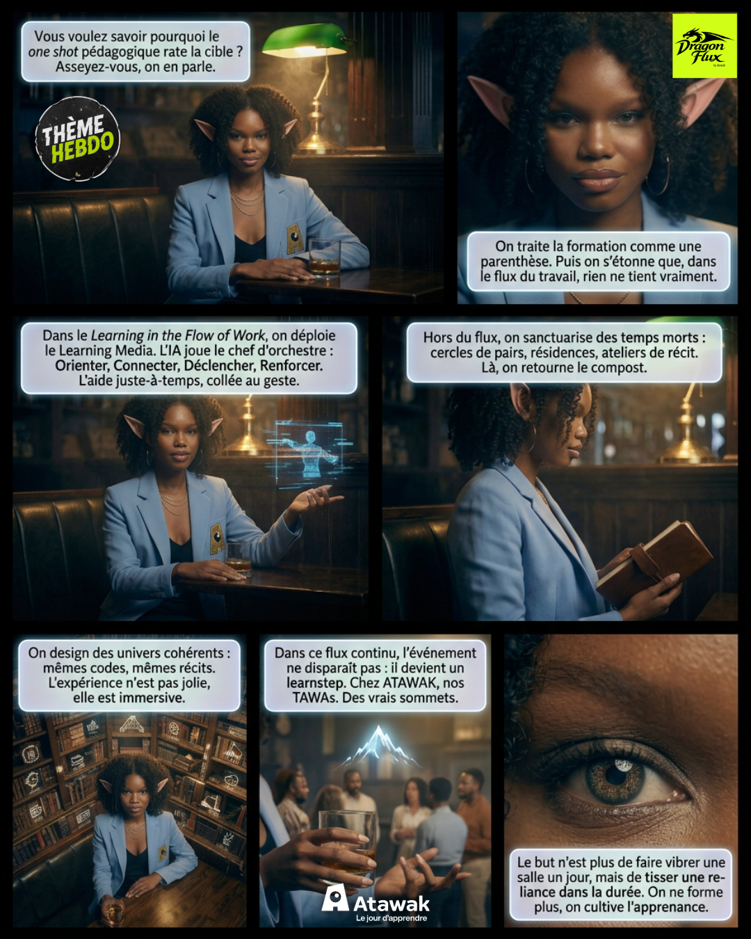Le learnstep : dans ce flux continu, l’événementiel ne meurt pas, il redevient sacré. C’est le moment mémorable, le “pic” émotionnel qui vient briser la routine et marquer un tournant. Chez ATAWAK, ce sont nos TAWAs : des étapes significatives qui laissent une trace dans le parcours. Sans ces sommets, la routine finit toujours par niveler les talents.
