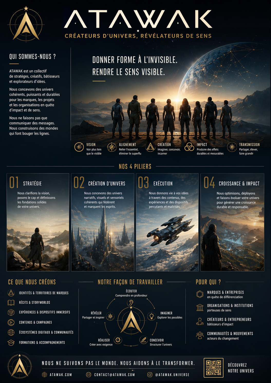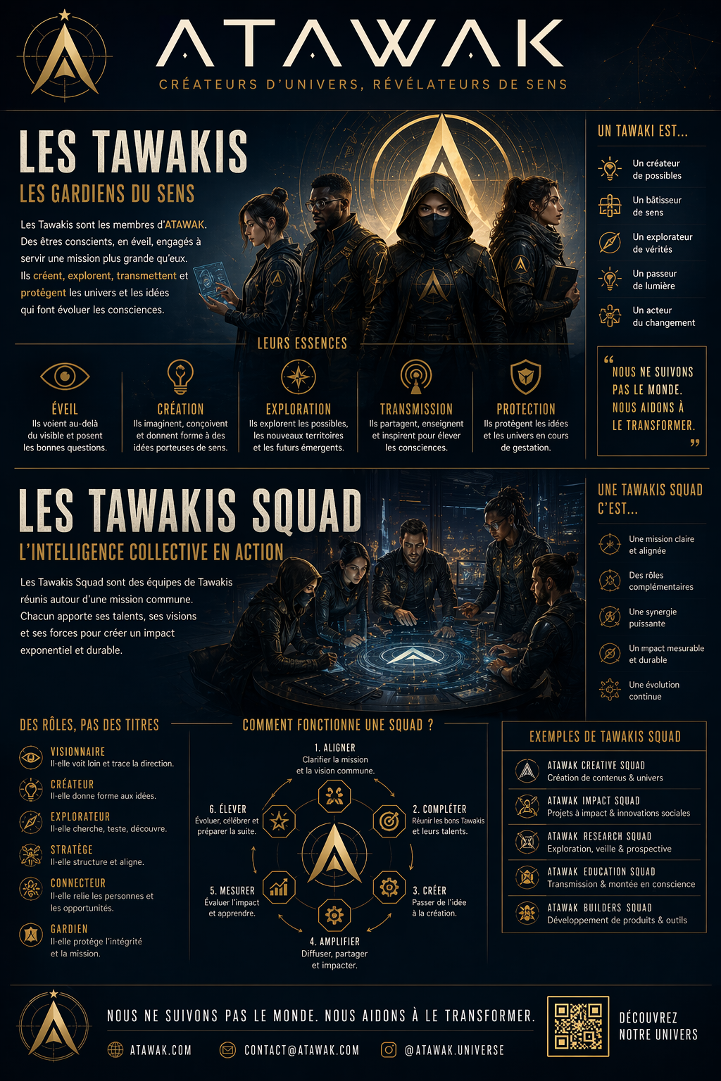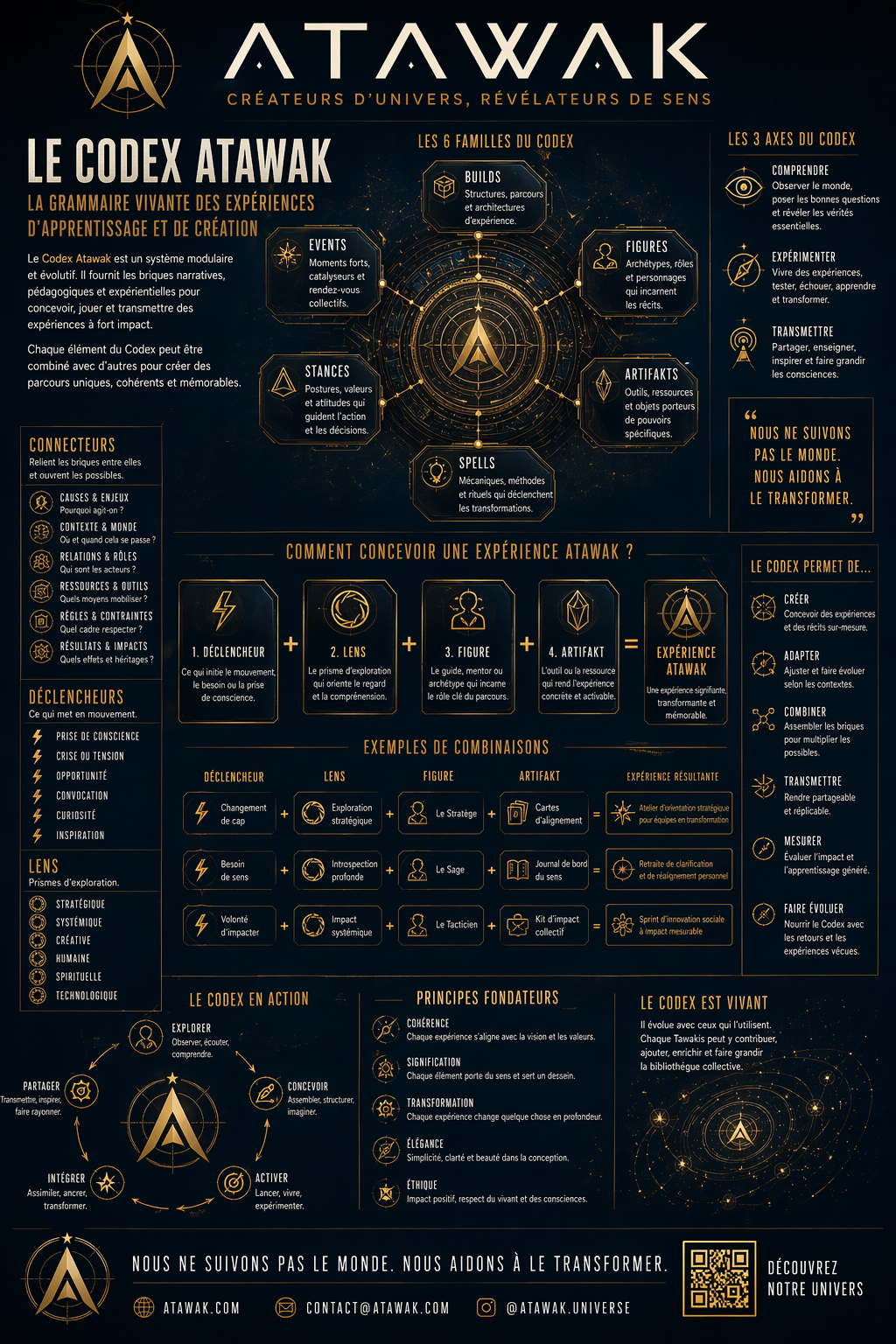 Petit test GPT-Image-2 en passant : j’ai demandé à ChatGPT de me créer un triptyque d’infographies à partir de ce qu’il savait déjà de mon univers : ATAWAK, les Tawakis et le Codex.