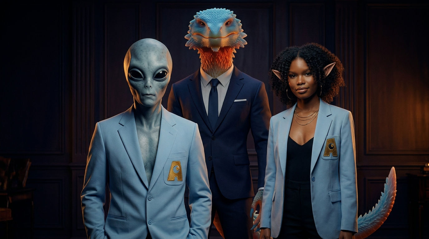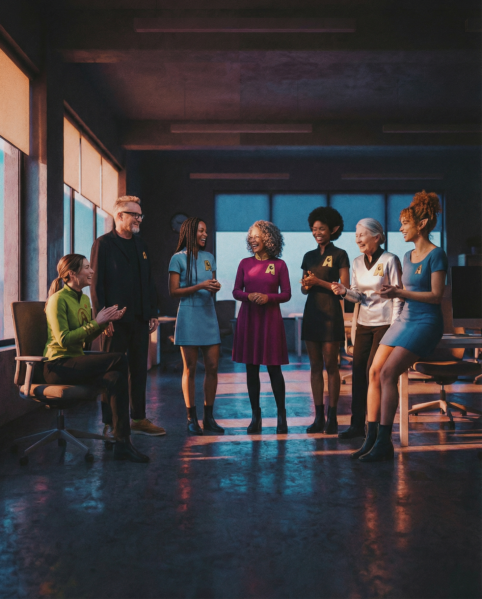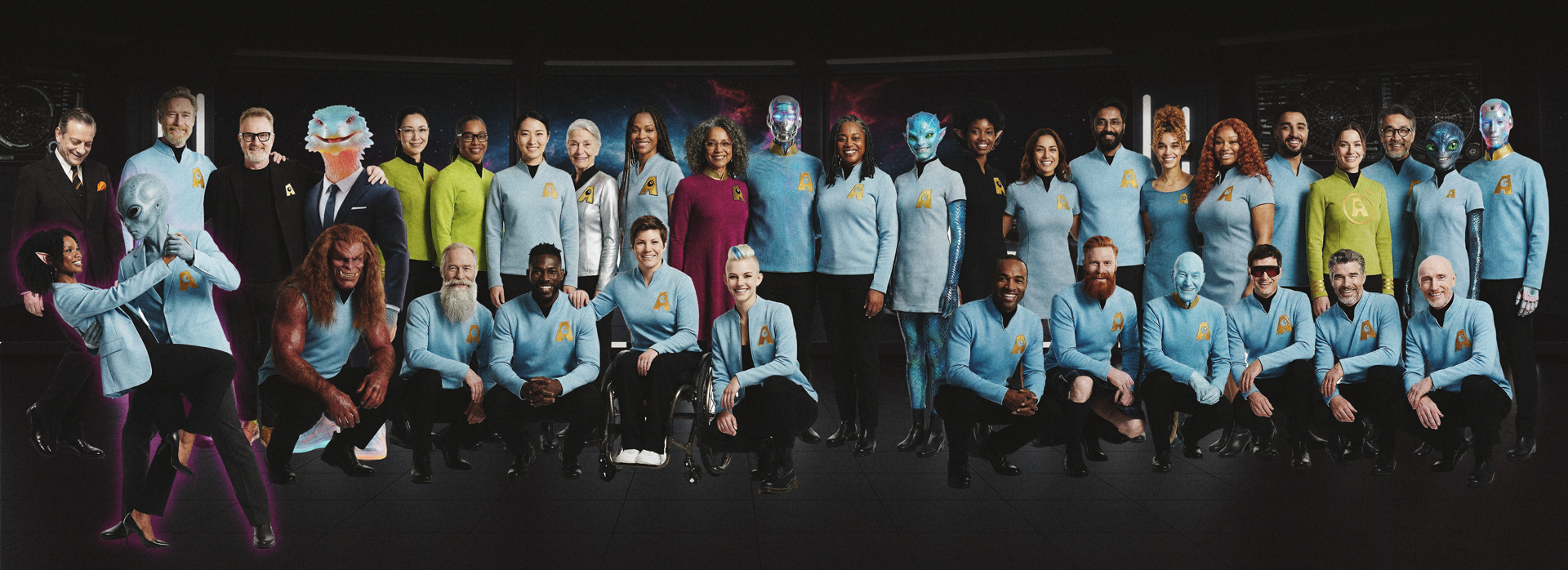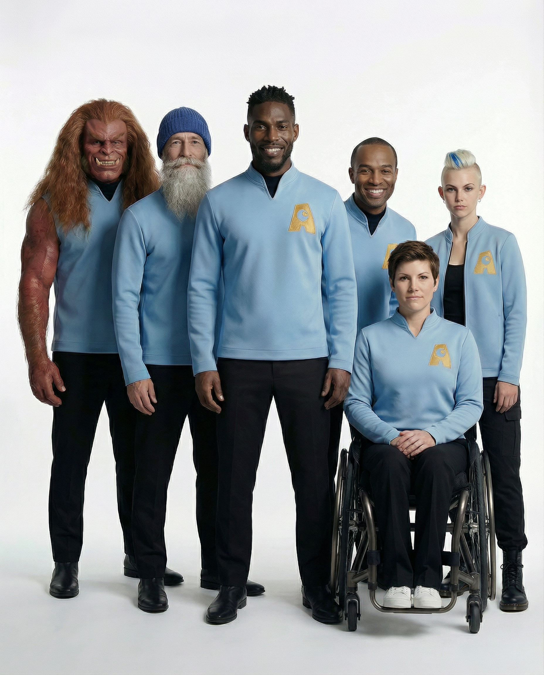 Une quarantaine de personnages. Chacun a un nom, un rôle, une appartenance lisible dans la couleur de son costume. Les verts tiennent la qualité. Les bleus portent la formation. Le noir désigne le conseil, chacun incarne une position dans un univers.