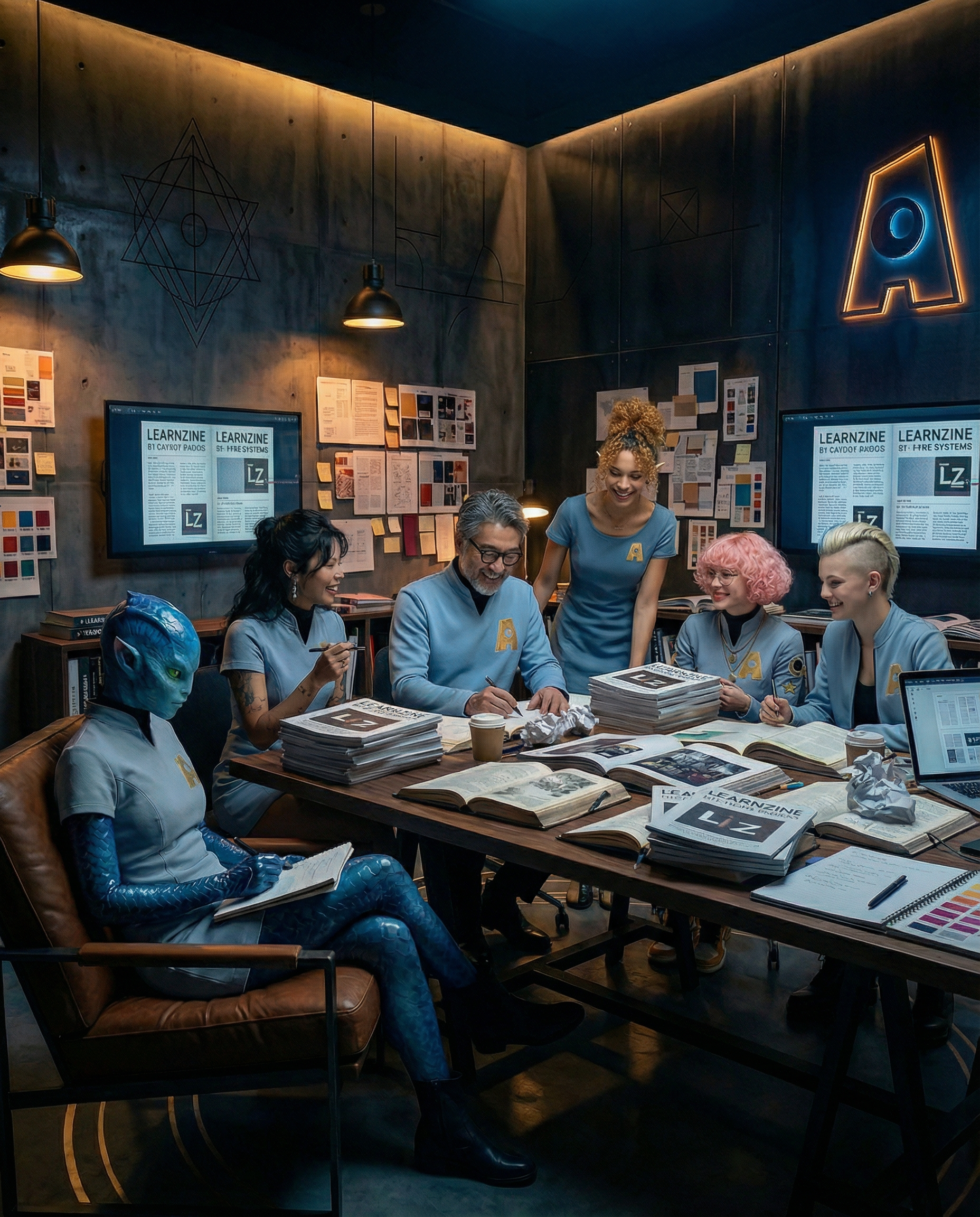 À l'échelle d'un organisme : c'est la signature totale - les figures, les codes, les mythologies, les rituels qui donnent à cet organisme son identité de monde. Un apprenant qui entre dans l'univers ATAWAK, par exemple, ne rencontre pas seulement des contenus ou des outils. Il rencontre des personnages qui ont des noms, des rôles, des voix et dont la couleur du costume encode immédiatement l'appartenance : les verts tiennent la qualité et la conformité, les bleus portent la formation, le noir désigne le conseil. Personne ne porte un badge générique "formateur". Chacun incarne une position dans un univers. Il trouve des espaces qui ont une esthétique cohérente et une fonction narrative propre. Une cosmogonie implicite - VALENS pour professionnaliser, MUTANS pour explorer - qui structure l'offre sans l'aplatir.