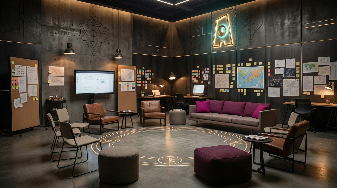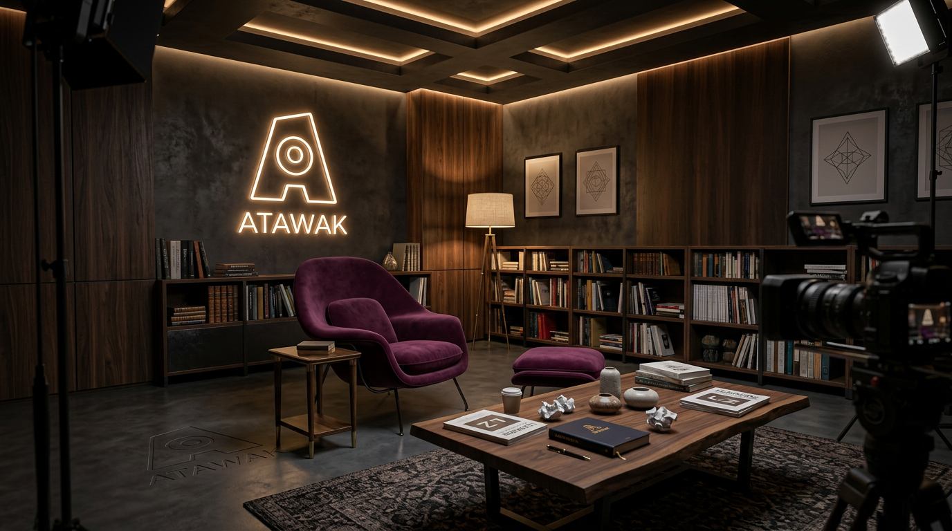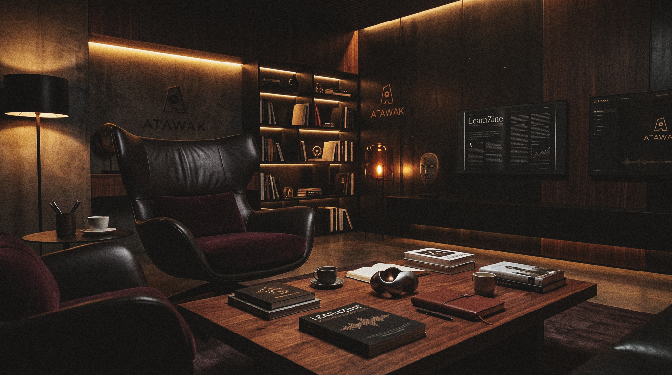 ATAWAK est un studio de design et de production de contenus apprenants. Son univers compte aujourd'hui une quarantaine de personnages, chacun nommé, positionné, doté d'un rôle précis dans l'organisation. Sa palette chromatique encode les fonctions : les verts pour la qualité et la conformité, les bleus pour la formation, le noir pour le conseil. Ses espaces de travail ont des noms et des atmosphères — pas une "salle de formation", pas un "bureau", mais des lieux qui racontent quelque chose avant même qu'on y entre.